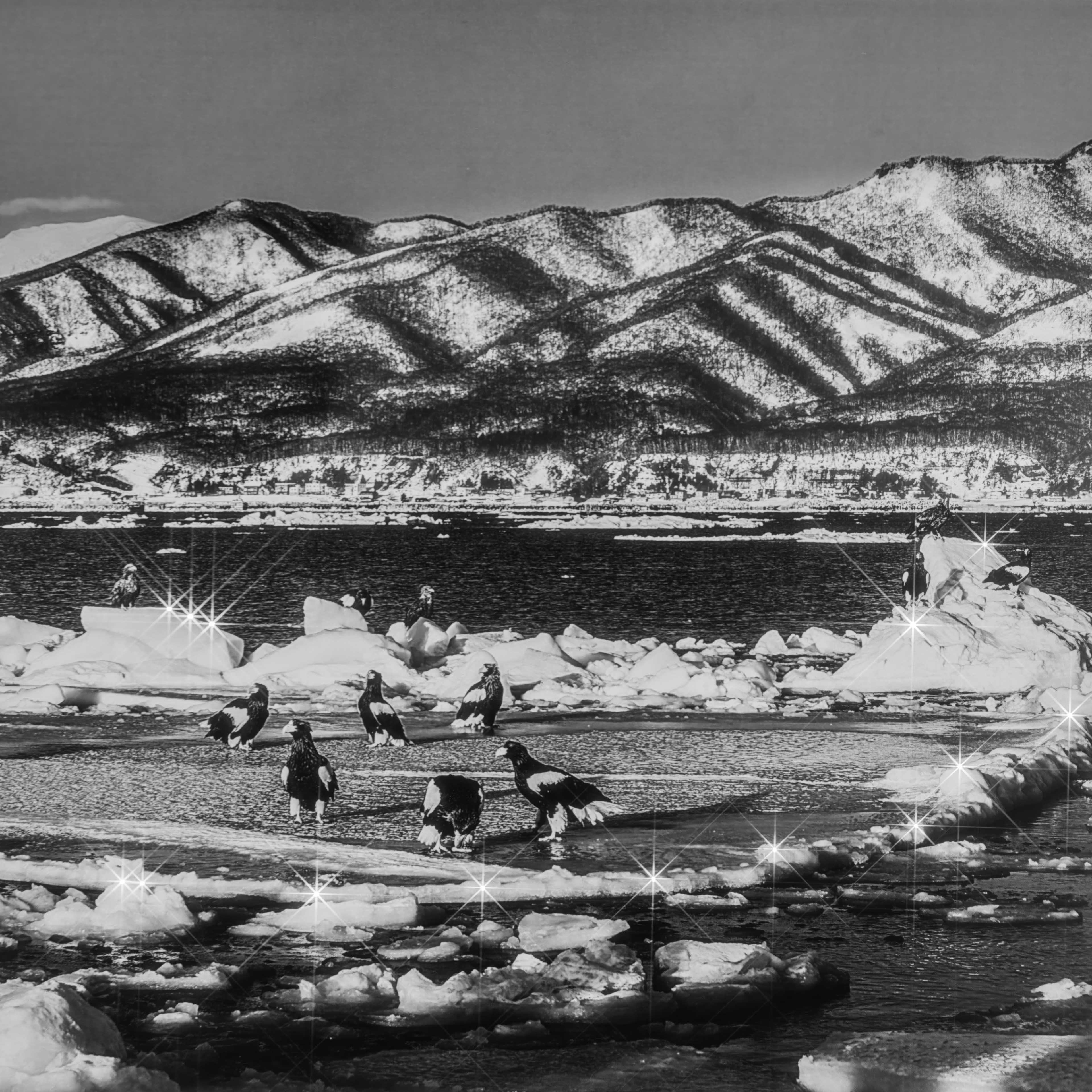 Steller's sea eagles gather in flocks on the pack ice off the coast of Hokkaido to fish. This idyllic scene features villages and the hills of Hokkaido in the background. The star-like reflections on the ice, added in the studio, symbolize the hope that the pack ice will form again next February despite global warming. This allows the eagles to catch enough fish in a short time to strengthen themselves for their long journey north to their breeding grounds.
