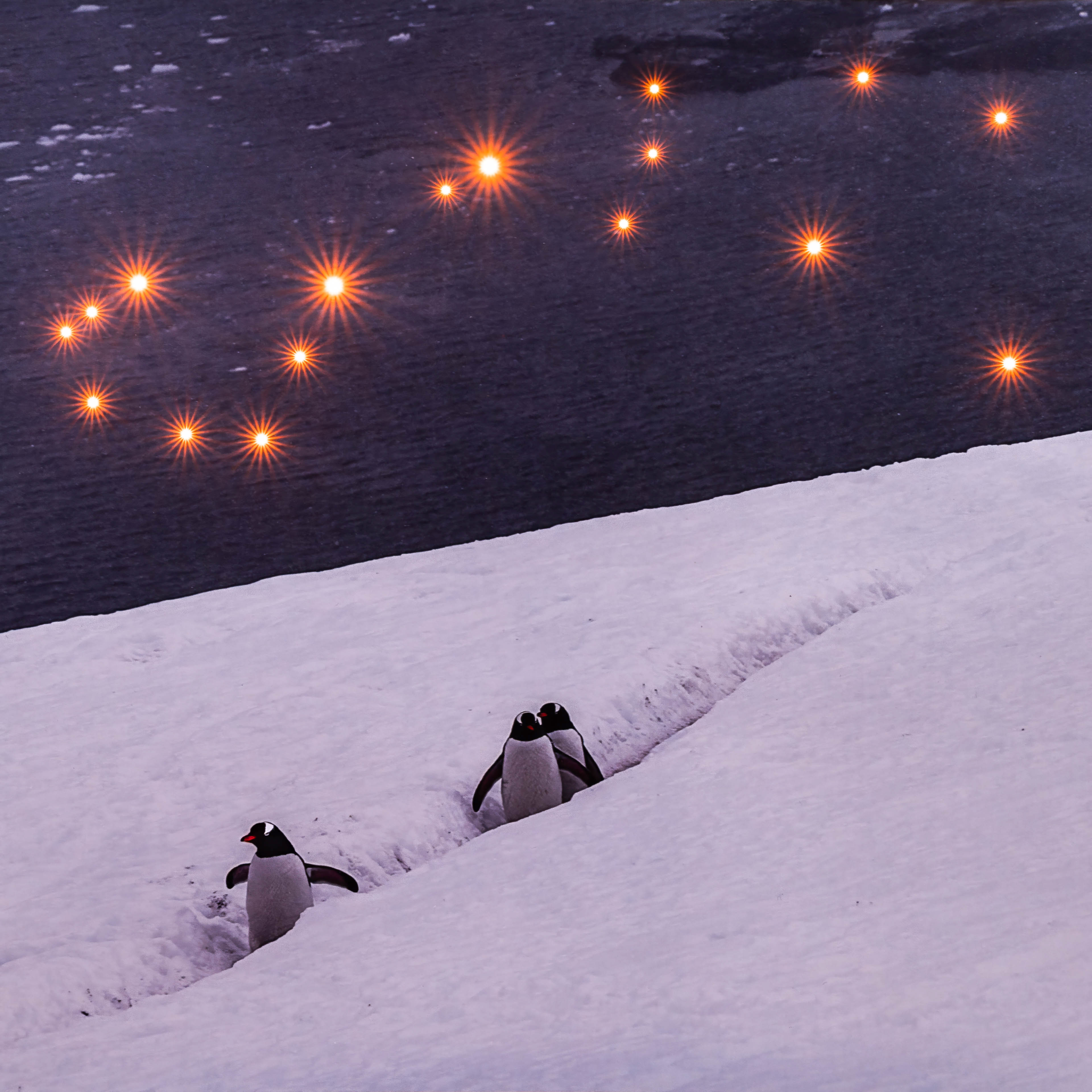 Gentoo penguins walk along a penguin highway, leading them to the sea. This scene repeats regularly as they need to feed their chicks. In the studio, integrated star constellations of the Southern Cross and Scorpion safely guide the tireless penguins to their fishing grounds. Despite the dramatic changes enveloping Antarctica due to global warming, the presence of these constellations suggests there is hope that all is not yet lost.