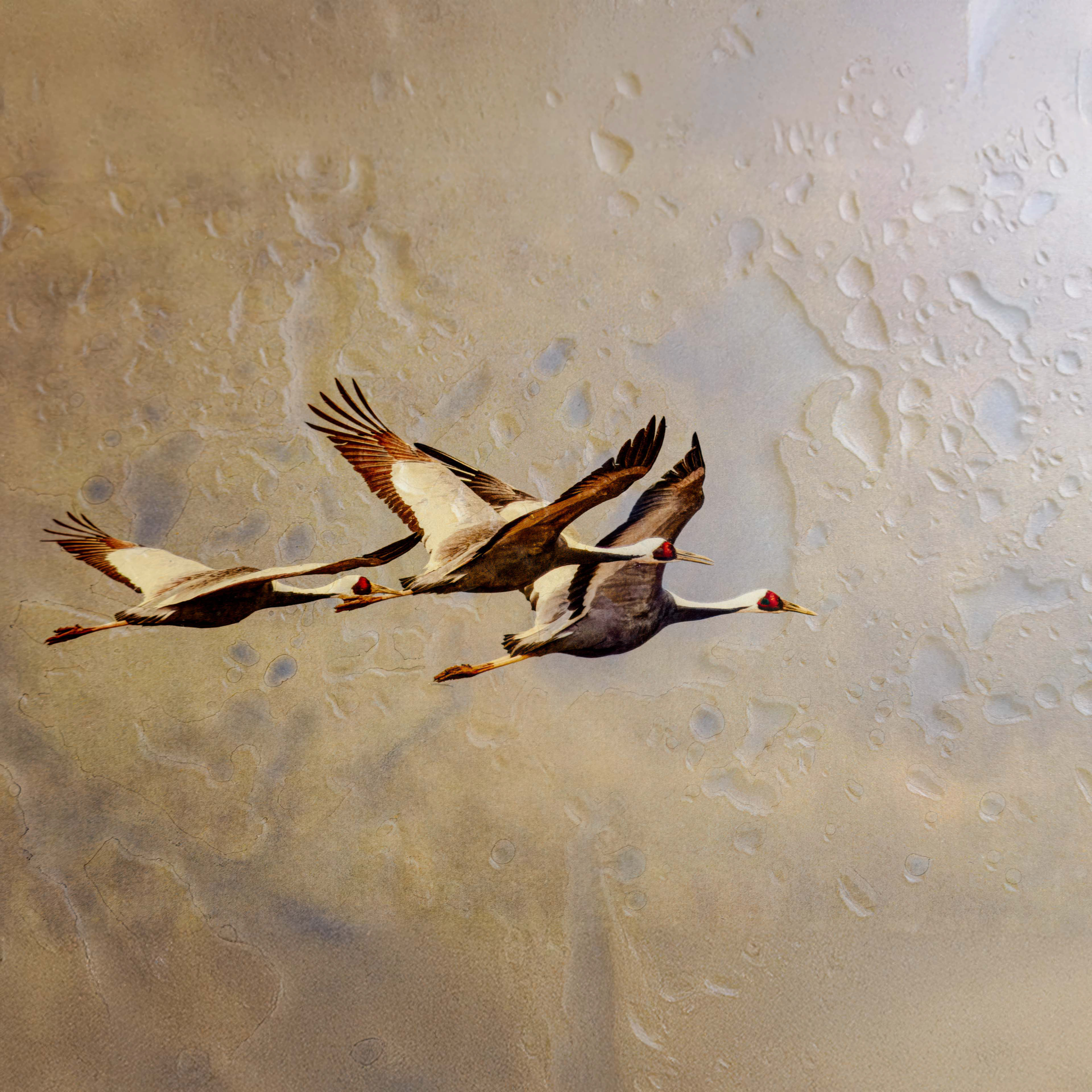 A family of cranes flies in formation across the Japanese sky, with the parents showing their offspring where to find food. Everything seems natural and peaceful. The sky has been subtly altered in the studio to symbolize how the habitat in the winter has gradually changed to the detriment of the cranes. The image attempts to symbolize that these changes are only visible upon closer inspection and can have enormous long-term effects.
